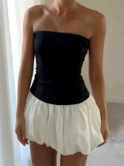 Women Strapless Mini Dress Summer Solid Color Puff Bubble Party Dress for Cocktail Beach Streetwear