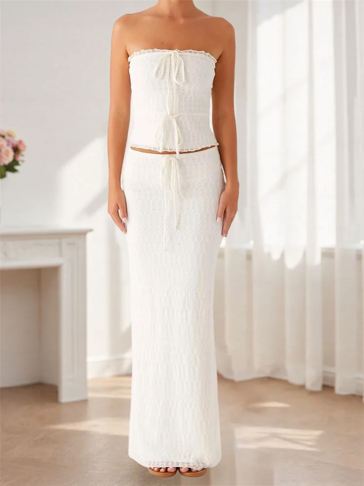Women Summer Outfits Solid Colors Crop Drawstring Bandeau and Elastic Long Skirt Set for Streetwear Aesthetic Clothes