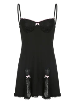Women Summer Dress Y2K Aesthetic Gothic Kawaii Sexy Dress Lace Bow Trim Sleeveless V Neck Mini Split Dresses